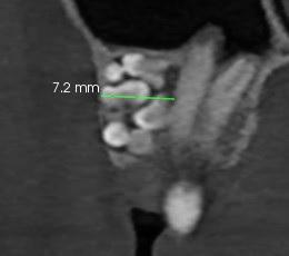 Składowe zębiaka położone są blisko korzenia policzkowego dalszego zęba 16. Nie uwidoczniono cech resorpcji zębów sąsiednich porzez guz.