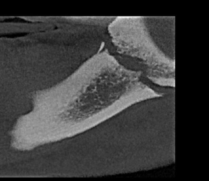 Szeroka szczelina - złamanie przebiega w poprzek kości żuchwy w projekcji zęba 48.